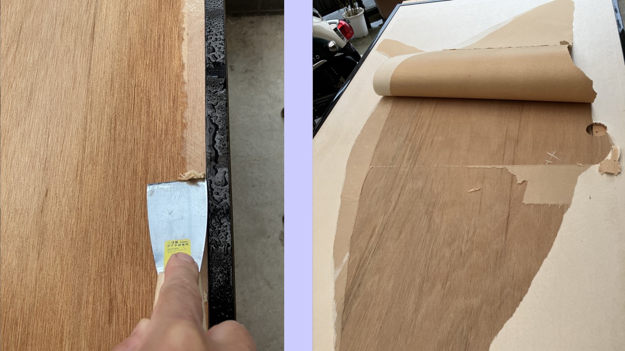 ↓廊下に面した襖は、板襖です。まずは、古い襖紙の除去。霧吹きで水を掛けると糊が溶けて簡単に除去でします。