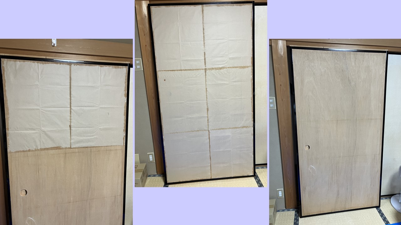 皺が除去できませんでした。和紙は乾いた後に霧吹きを掛けること、ピンと張りました。そこで板襖は リメイクシートをを貼ることにしました。