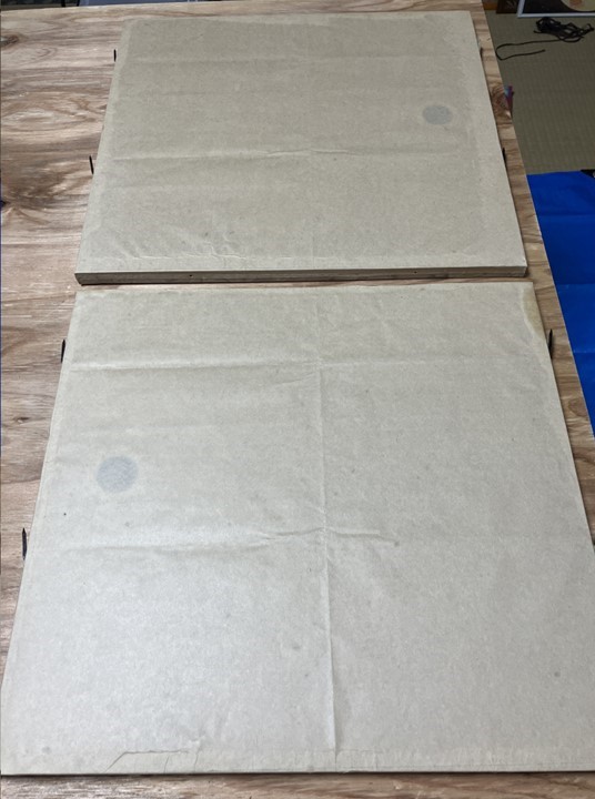 ↓ちり紙を貼り付けます。この上に襖紙を貼ります。今回は、表面がナイロンの木目を選択しました。