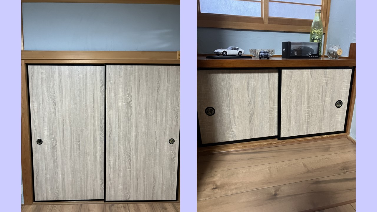 納戸の本襖は上手く貼れていましたが、出入り口に合わせて、更にリメイクシートを重ね貼りしました。
